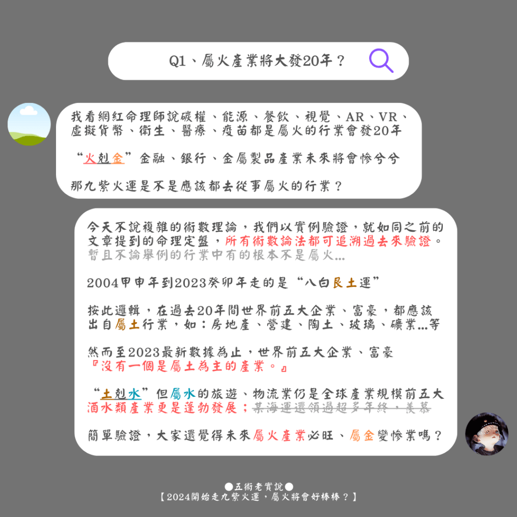 就如過去 20 年走的是八白土運,房地產價格確實不斷上漲,但細追下來,屬土相關行業卻也不是過去 20 年的最頂流產業,其中也有不少出大事、倒閉的屬土產業,也有房價崩盤的區域,投資房產被套的也大有人在,範圍式的應用,似準非準。