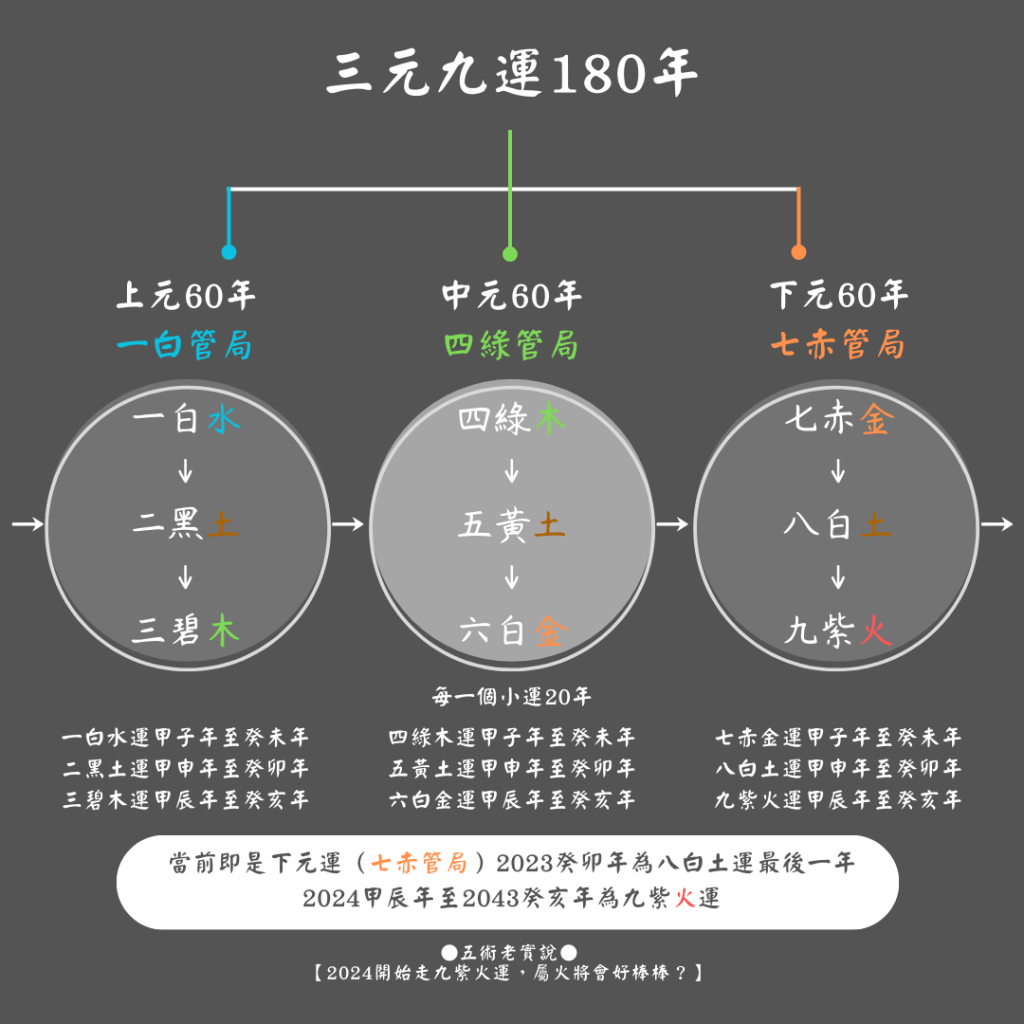 想了解『三元九運』的運轉週期、詳細年份,看此圖: